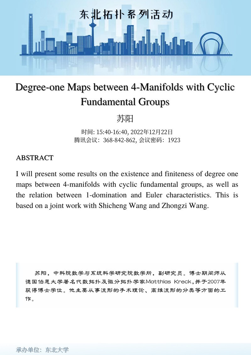2022年12月22日的主讲人为中科院数学与系统科学研究院数学所苏阳,报告题目为: Degree-one maps between 4-manifolds with cyclic fundamental groups
