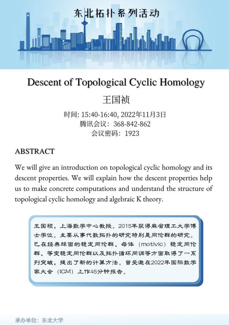 2022年11月3日的主讲人为上海数学中心王国祯教授,报告题目为: Descent of Topological Cyclic Homology.